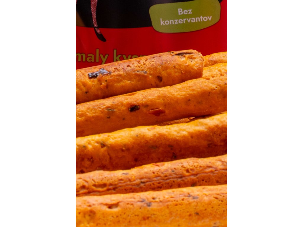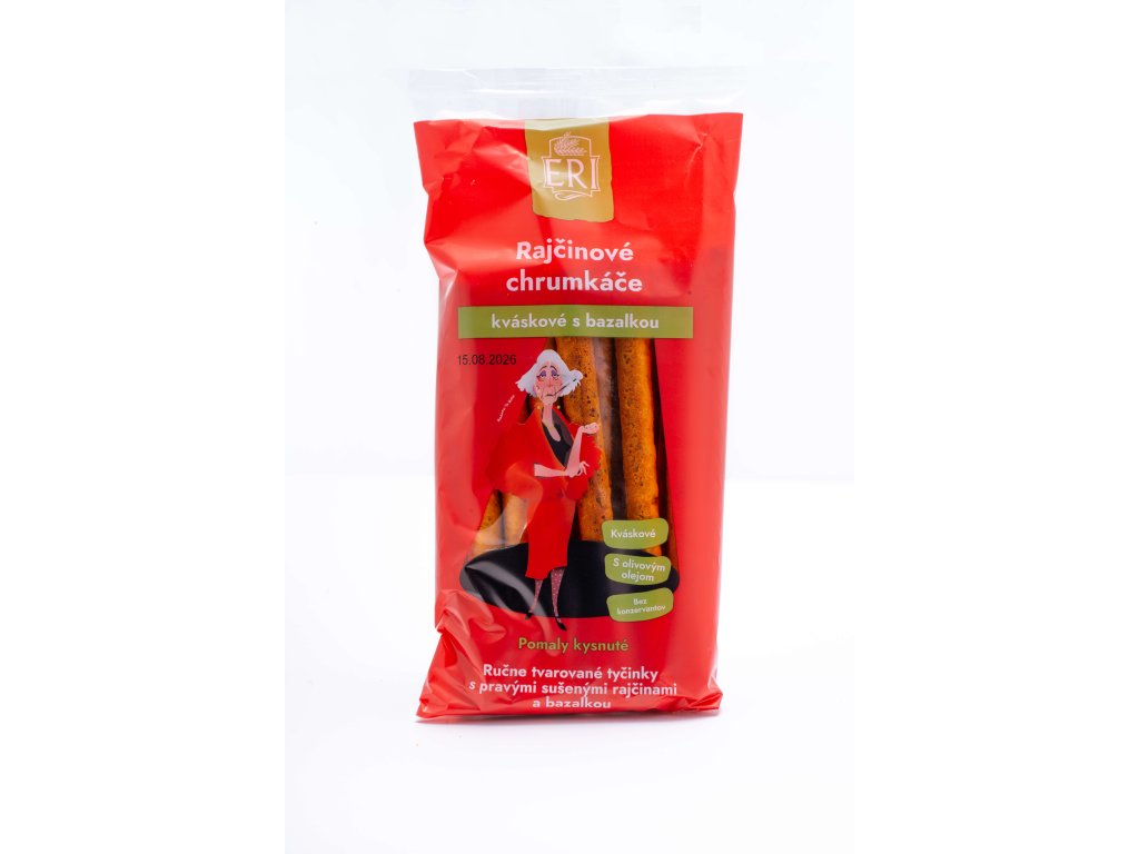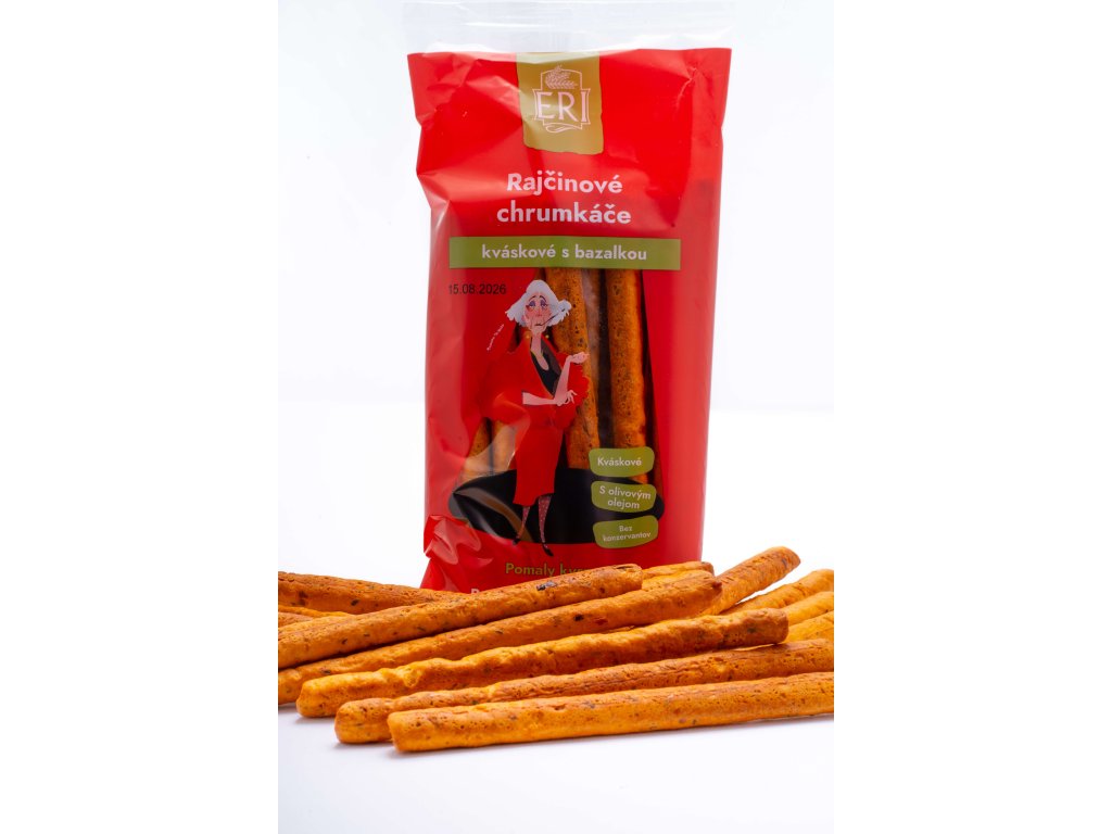 Rajčinové chrumkáče – remeselné kváskové tyčinky so sušenými rajčinami a jemnou bazalkou. Výrazná chuť pre pravých gurmánov.