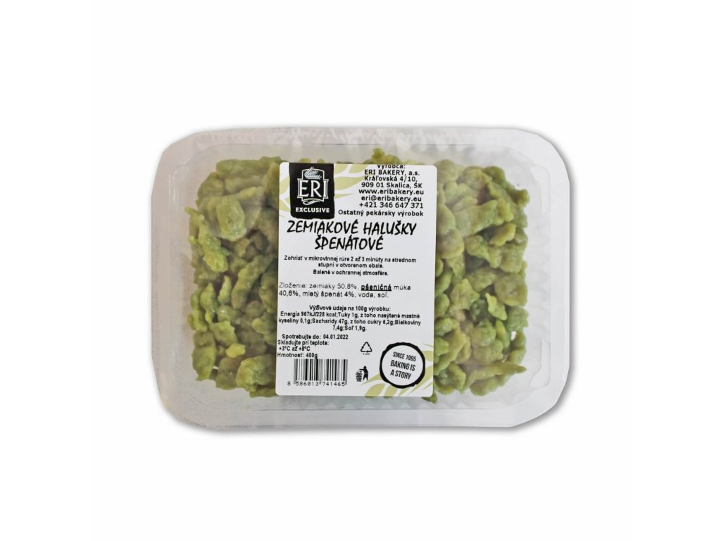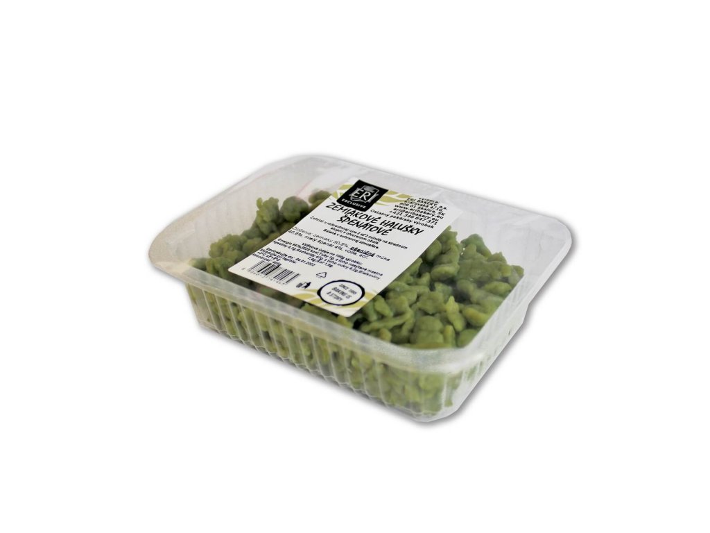 Tradičné slovenské halušky pripravené zo zemiakov, múky a sušeného špenátu podľa poctivej receptúry, vhodné ako príloha alebo ako hlavné jedlo s bryndzouy syrovou omáčkou alebo cesnakovým maslom.